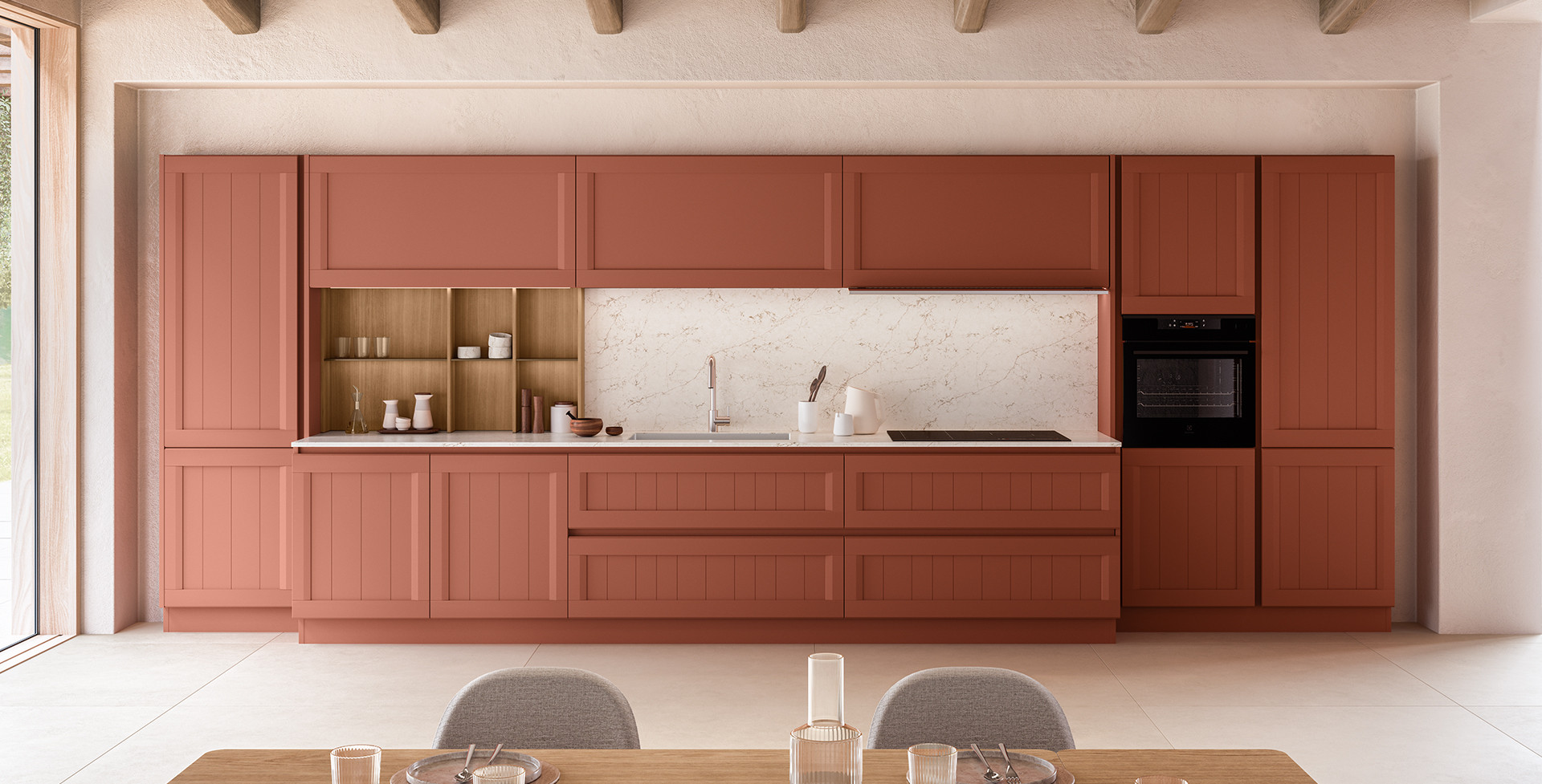 Il nuovo minimalismo, caldo ed accogliente, trova nel legno e nelle finiture laccate di Armonia, una chiara manifestazione del suo essere superamento delle convenzioni e nuovo modo di concepire la voglia di ben-essere. Una cucina che unisce originalità e forte personalità anche attraverso l’anta a telaio, solcata da una raffinata dogatura verticale.